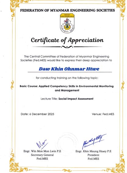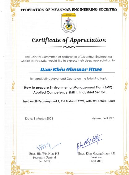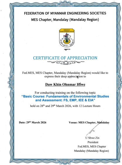 Members of Myanmar Environmental Innovation Foundation, MEIF worked several EIA projects under the collaboration jobs of Resource & Environment Myanmar Company Limited, REM-UAE Consultant Company Limited, CRE Company Limited and a Research Institute namely Myanmar Environment Institute (MEI).